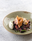 Салат із запеченого Буряка з Лососем гарячого копчення, вершковим кремом Райфорт, витриманим Бальзаміком та Горіховою олією